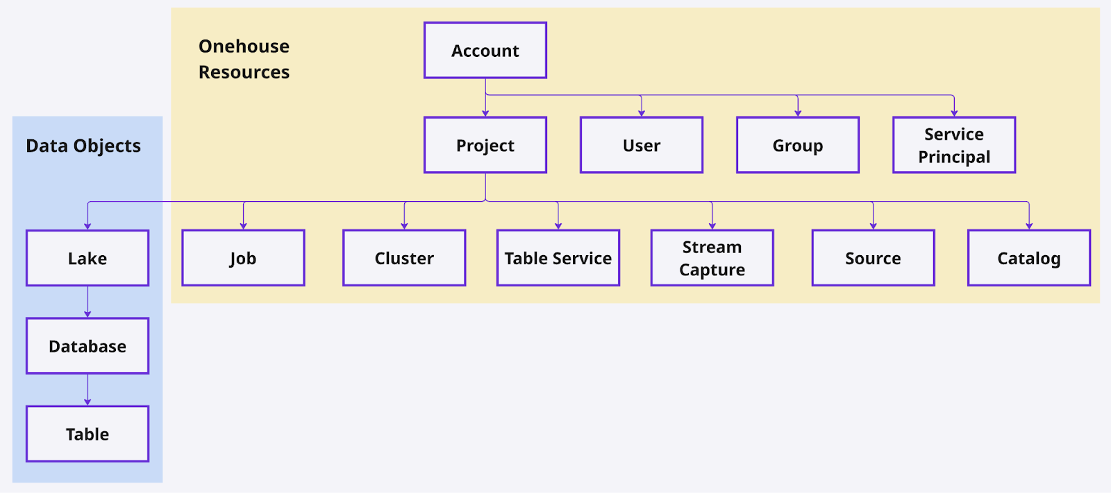 | Onehouse Resources | Logical Onehouse entities in your account or project. | Roles | Account, Projects, Users, Groups, Service Principals, Jobs, Clusters, Table Services, Flows, Sources, and Catalogs |